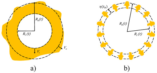 When the instability amplitude becomes larger than a characteristic length of the spray (Figure 2b) [34], which can be chosen equal to the film thickness (i.e., the difference between droplet and bubble radius ), breakup takes place. It follows that the breakup criterion is equal to: