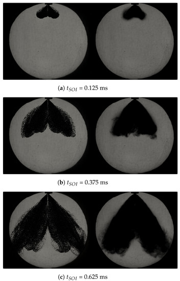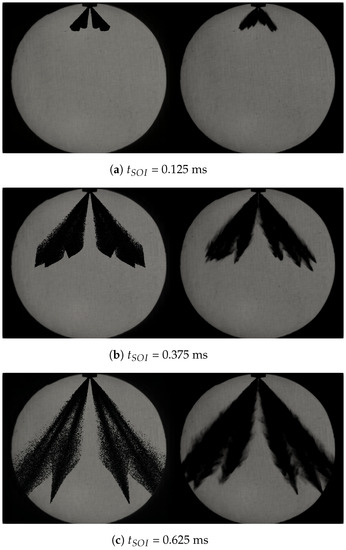 However, when flashing sprays are issued from multihole injectors, the single plumes deviate toward one another and combine into a single jet. This phenomenon is the so-called “spray collapse” and frequently takes place in flashing sprays. A collapsed spray causes spray-wall impingement (which increases the generation of exhaust soot) and it greatly reduces the combustion quality [7,17,18].