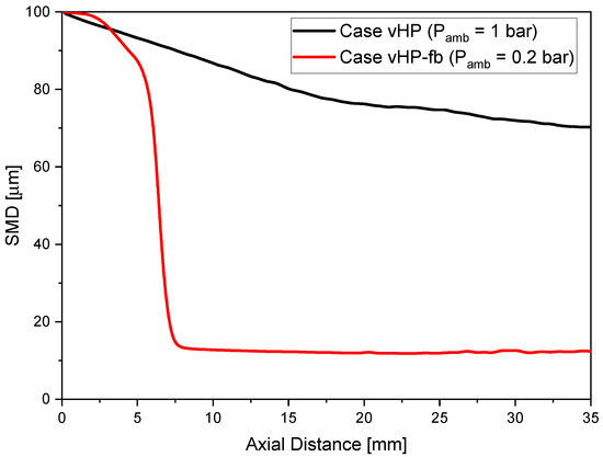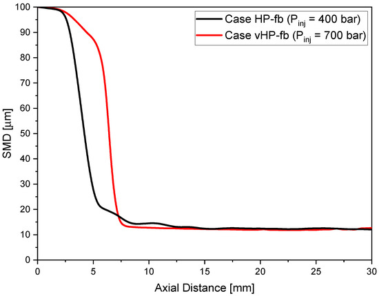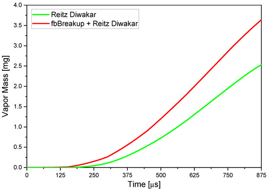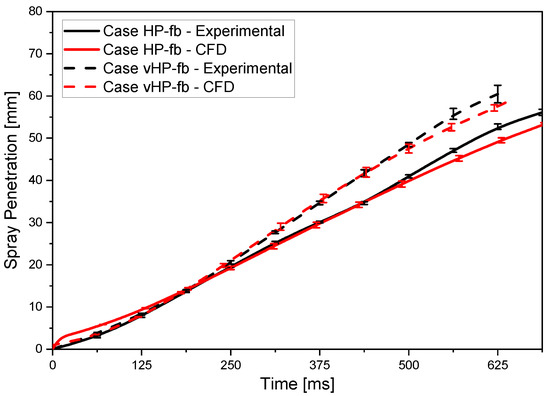 This section aims to assess the benefits of using the effervescent breakup model in the simulation of superheated sprays. The droplets’ size and the vaporization process were investigated. A further simulation, concerning case HP-fb, was performed adopting the Reitz-Diwakar model alone deactivating the fbBreakup model. The penetration lengths computed using Reitz-Diwakar and fbBreakup+Reitz-Diwakar breakup models are compared with the one experimentally measured in Figure 10.