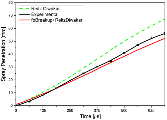 Comparison of the numerical penetration curves computed using Reitz–Diwakar and fbBreakup breakup models with experimental measurements for case HP-fb.