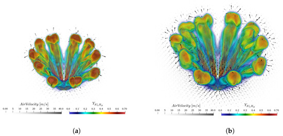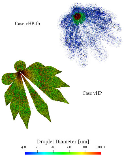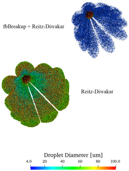 Figure 11 depicts the spray morphology at 0.4375 after the SOI; the droplets are represented, and they are colored accordingly with their diameter.