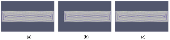 Mesh motion in the first test case during a single period of s. (a) Initial condition at s. (b) Maximum compression of the domain at s. (c) Return of the domain to the initial position s.