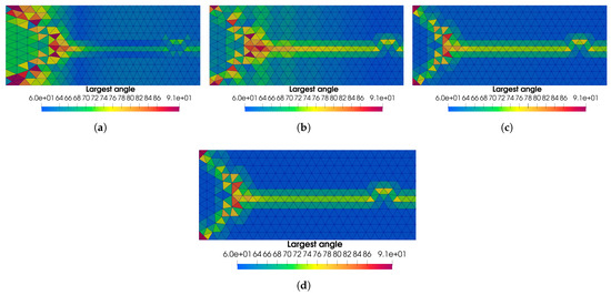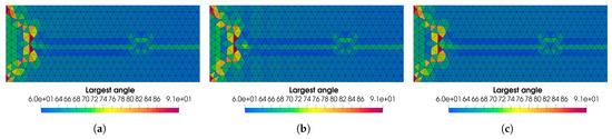 Figure 4 displays the largest internal angle for each mesh triangle at the maximum compression of the domain ( time s) for three values of the stiffness coefficients Pa and the same density coefficient kg·m). A high maximum internal angle for a triangle corresponds to an element with a bad aspect ratio. It could therefore impact the quality of the physical solution or even lead the simulation to stop. It is easily observed that the lowest stiffness coefficient excessively localizes the deformation close to the moving wall as expected. The global mesh motion becomes acceptable with the intermediate stiffness value, and the improvement provided by the highest value thus does not compensate for the additional penalization induced on the stability time step, ten times smaller following Equation (31).