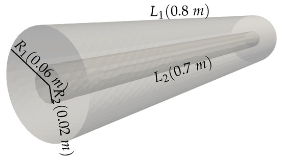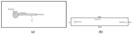 The Turek benchmark is a classical validation test case for fluid–structure interaction solvers [33,34]. In this test case, the fluid flows around an elastic obstacle clamped to a rigid stationary cylinder (see Figure 7). The fluid domain length is m, and its height is m. The cylinder center coordinates are m, and its radius is m. The elastic structure, denoted by has length m and height m.
