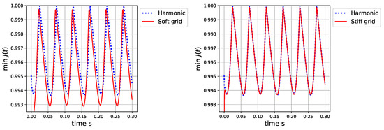 Evolution of the minimum of the Jacobian determinant, J, for the soft (left) and stiff (right) grids over three oscillation periods of the bending mode of vibration of the clamped-free beam. The dashed lines correspond to the evolution of J for the harmonic grid.