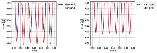 Figure 10 plots the normalized minimum area cell’s grid evolution. As before, the stiff grid fits perfectly with the harmonic mesh movement, while the soft grid presents a shift. Soft grid cells have a smaller minimum area than harmonic grid cells. As a result, the soft grid is less accurate when the beam reaches its maximum amplitude. Despite this, the cells do not degenerate and return to their original shape at the end of each period, so the soft grid remains consistent for computations. Similarly, both quantities suggest that the motion of a still grid is close to the harmonic grid behavior.