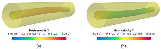 Motion of the pinned-pinned inner cylinder. (a) Beam at its maximum compression upward at s (mesh velocity in m·s). (b) Beam at its maximum compression downward at s (mesh velocity in m·s).