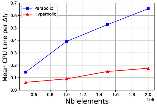 The critical time step ratio for the hyperbolic approach increases with the problem’s size and starts around 150 for the coarsest mesh to obtains close to 200 for the most refined one. This increase is related to the different evolution of the computational cost of the grid solver along with the mesh size for parabolic and hyperbolic approaches (see next section) and is likely to continue for bigger meshes, to the advantage of the hyperbolic grid motion. Given the ratios’ values in Table 2, the chosen fluid problem seems detrimental to the proposed approach. Only the soft grid appears competitive with the harmonic equation for the considered meshes. It is, however, only the consequence of the favored simplicity of the current test case, implementing, in particular, no initial flow or turbulence modeling. For instance, with an additional imposed flow at the average velocity of 2 m·s, the time step ratio resulting from the CFL condition would instead be given by the ratio between the speed of the sound in the grid problem and the average velocity in the physical fluid problem. In the proposed geometry, this would produce a ratio of 16 for the soft grid and 158 for the stiff grid, improving the competitiveness of the hyperbolic approach. Increasing the flow velocity to 5 m·s, thus entering the turbulent regime in the proposed geometry, and adding a transient turbulence model such as Large Eddy Simulation (see [35] among numerous references) would remain within very classical problems in the field of CFD simulation. It would further enhance the interest for the hyperbolic equation to solve the grid problem, with time step ratios going down to around 6 and 63 for the soft and stiff grids, respectively. The time step ratio is finally likely to go down to 1 and below if the proposed approach were to be applied to compressible flows, for which the parabolic harmonic equation then appears very penalizing for the ALE grid motion. The statements above are summarized in Table 3.