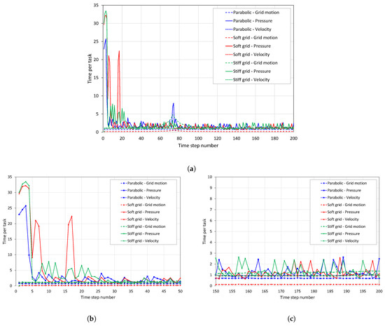 Figure 17a exhibits a singular short peak around 75 time steps, but it is difficult to characterize since it involves the Pressure task with the parabolic grid motion only and to a lesser extent the Grid Motion task for the stiff grid only. This particular behavior would require extensive analysis and does not modify the main conclusions drawn in the following so that it is decided to focus on the other main aspects of the plot, shown in Figure 17b,c.