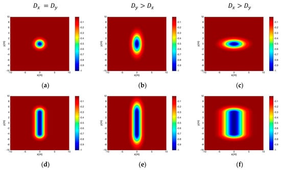 This case considers layered reservoirs in which the hydraulic diffusivity is not a scalar but a tensor quantity sensitive to direction in the (x, y)-plane represented by the 2D-diffusivity tensor, . If we consider the case when for , then the diffusivity in each direction will be denoted by and . The temporal pressure change in 2D-diffusion space with anisotropic diffusivity is [16]: