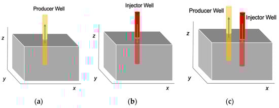 In this section, we track the Gaussian pressure transient evolution over time until it either ceases altogether due to pressure depletion or reaches a steady state for three illustrative, simple well systems (Figure 4). A single producer (Figure 4a) or a single injector (Figure 4b) will never reach steady-state flow because the pressure transient will advance in the reservoir until the entire reservoir attains the bottomhole pressure (PBH). The reservoir pressure is then said to be depleted, at which point the pressure gradient will no longer exist, the flow in the reservoir will cease, and the well will stop producing fluid from the subsurface. For cases with one producer and one injector (Figure 4c), a steady-state flow can be locally maintained in the region between the wells after the pressure gradient profile between the well pairs has been established (see below).