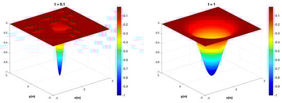 Case 1—Producer. The Gaussian pressure transient solution using Equation (8a) for a single producer (Case 1) located at the origin with isotropic diffusivity and at different times: top row (from left to right): bottom row (from left to right): .