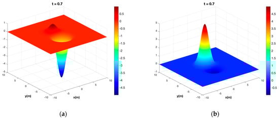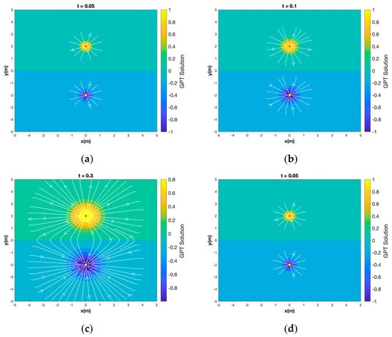 Case 3—Balanced Doublet. The Gaussian pressure transient solution using Equation (10b) for one injector located at and one producer located at with isotropic diffusivity and for the injector and for the producer at different times. Top row (from left to right): bottom row (from left to right): .