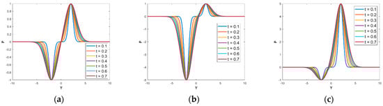Case 3: Pressure profile at over different times for a producer located at (0, −2) and an injector located at (0, 2). The vertical scale is the pressure, and the horizontal axis is the distance (y-values). (a) Balanced Doublet. (b) Unbalanced Doublet, for the injector and for the producer (net producer case). (c) Unbalanced Doublet, for the injector and for the producer (net injector case).