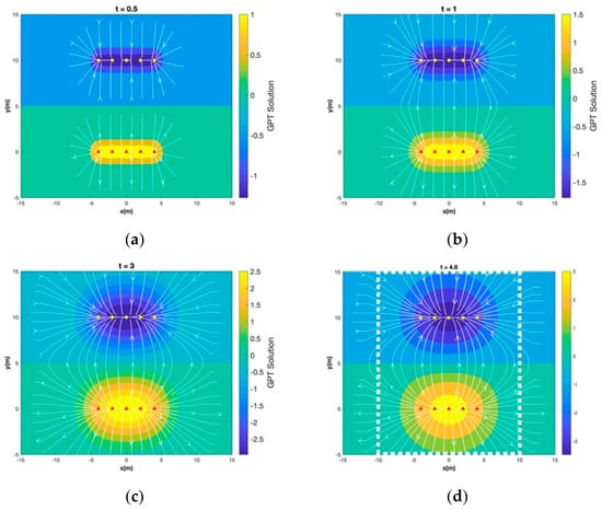 For the balanced doublet, the flow between the two wells will eventually reach a steady state when the pressure profile is represented by a straight line joining the points and , i.e., when the pressure profile has become stable and no longer transient—no change occurs with respect to time (Figure 11a). The flow in the region between the two wells (i.e., at ), reaches that steady state at . For , the max and/or min values of would start shifting beyond the original well locations, and the flow would become non-physical.