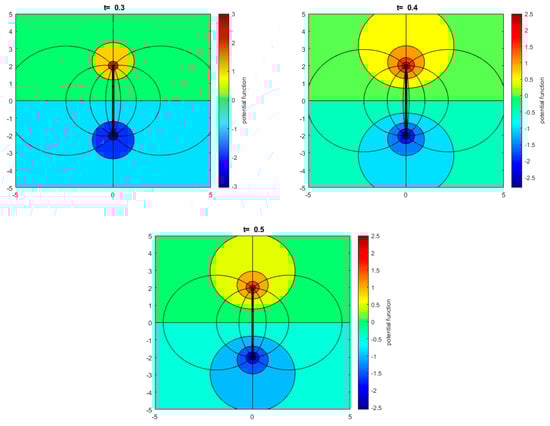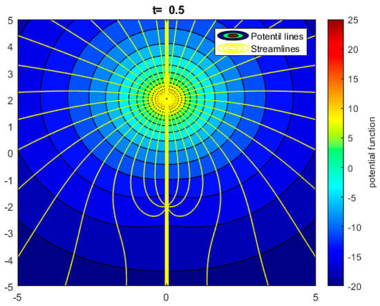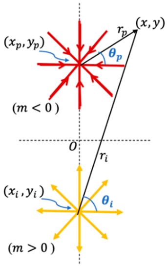 where and are the bottomhole pressures for the injector well and producer well, respectively, assuming the pre-existing pressure in the reservoir is . If , the system is called balanced doublet flow; otherwise, the system is called unbalanced doublet flow [24,25]. In [25], the authors used the somewhat un-English term unsymmetrical rather than asymmetrical. We are fine with both and prefer to use the dynamic term ‘unbalanced doublet’.