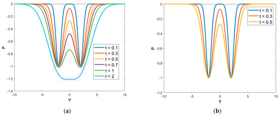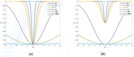 Figure 11a,b show the pressure transient profiles for different times near a producer located at and an injector located at . Here, x is fixed at and . In Figure 10a, the is for the producer well and for the injector well. In Figure 10b, the is for the producer well and for the injector well.