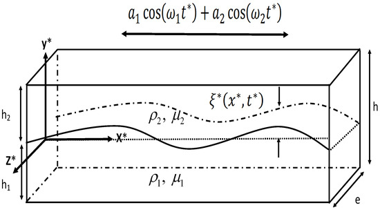 The instability of the interface of two superimposed immiscible liquid layers subjected to periodic horizontal oscillation is of practical importance and was studied by many researchers in various configurations [1,2,3,4,5,6,7,8,9,10,11,12,13,14]. Kelly [1] investigated the Kelvin-Helmholtz instability with two oscillating flows where the velocity fields are periodic. Using the linear stability analysis, he discovered situations where the oscillation stabilizes the unstable shear flow. Afterwards, Wolf [2,3] carried out the first experiments in which he observed the formation of a quasi-steady relief, called a frozen wave. Note that this relief develops when the oscillation intensity exceeds a specific threshold. Subsequently, the interface behavior of the fluid layers of different densities was theoretically studied by Lyubimov et al. [4]. They reduced the linear stability problem under the inviscid approximation to the Mathieu equation. It was found that the basic instability mode, associated with the development of the Kelvin-Helmholtz instability at the interface between counter-streaming flows, occurs, and that the possibility of parametric resonance can take place. For inviscid fluids, there is no threshold for the parametric instability. Furthermore, for sufficiently high vibration frequencies, the parametric instability is sensitive to viscous damping and thus occurs over a narrow range of wavenumbers. The work by Lyubimov et al. [4] was extended by Khenner et al. [5] to the parametric resonant regions of instability associated with capillary wave intensification at the interface. Note that, in these works [4,5], numerical results were also discussed in the viscous case. It was found that the parametric instability is strongly damped by viscosity and the Kelvin-Helmholtz mode is the most unstable. Later, Ivanova et al. [6] experimentally found that, in the circular translational oscillation of a system of immiscible fluids of different densities, a steady-state relief excitation, associated with the Kelvin-Helmholtz instability, is determined by the square of vibrational velocity, while the azimuthal fluid flow associated with the generation of an average vorticity in the skin-layers is determined by the oscillatory Reynolds number. Subsequently, Talib et al. [7,8] experimentally and numerically investigated the effect the viscosity contrast on the linear stability threshold using the spectral collocation method. They showed that, depending on the value of the density contrast, either the Kelvin–Helmholtz or the first resonant mode may be the most unstable. These two modes exhibit opposite dependencies on the viscosity contrast with a sharp stabilization of the first resonant mode, while the threshold of the Kelvin–Helmholtz mode exhibits a sharp reduction. Thereafter, Yoshikawa et al. [9] conducted a theoretical study to investigate the effect of viscosity and its contrast at the interface. This study was considered for the liquid layers of infinite depth and for an amplitude of the oscillation smaller than the wavelength of the perturbation. The results in this case are in good agreement with those of the previous experiments and theoretical studies [7,8]. Experiments were also conducted by Yoshikawa et al. [10] to show that the threshold and wavenumber significantly depend on the oscillation frequency. It turns out that the waves found are longer than those predicted by the inviscid theory of the Kelvin-Helmholtz oscillatory instability. In the same spirit, Jalikop et al. [11] showed that the gravity-capillary waves in a horizontally oscillating two-layer system, which are often referred to as frozen waves, lose stability in the presence of oscillatory transverse amplitude modulation.