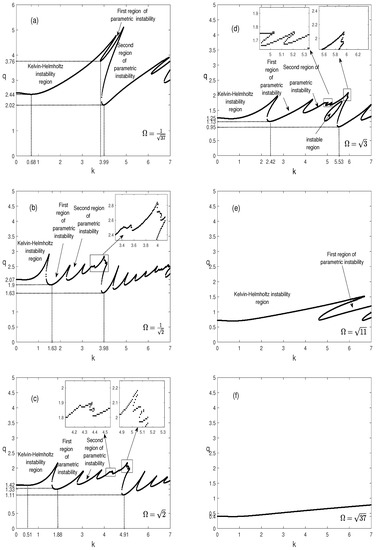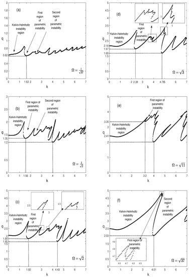 For , inspecting the curves in Figure 6a–c, it can be seen that, for , the curves of Figure 6a correspond to the periodic oscillation [13] as in Figure 2, and the increase in the oscillation amplitude, from to , gives rise to further regions of parametric instability in the wavenumber interval without a significant effect on the thresholds. Indeed, the thresholds of the most dangerous modes and those of the Kelvin-Helmholtz instability region are not affected.