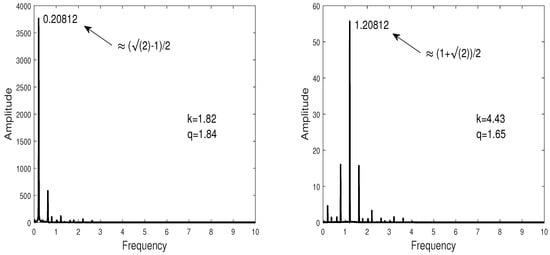 To better highlight the quasi-periodicity at the threshold of the parametric instability (resonance), we refer to the method of harmonic balances [17,18], which consists of inserting the expression into Equation (27). Results are obtained by a truncation of the infinite sums in this expression and then replaced by sums from 0 to N for n and from to N for m, respectively, which allows us to obtain two coupled homogenous algebraic systems in and which verify and . The system has a non-trivial solution if its determinant vanishes. For each N, the dimension of this system is . In this context, in Figure 4, we illustrate the frequency spectrum of solutions generated at the minimum of two resonances of Figure 3c. Figure 4 shows the largest amplitude corresponding to the dominant mode. Each dominant mode can be identified in the double series we have just presented. Indeed, the numerical procedure shows that the thresholds of the two resonances correspond, respectively, to the modes and .