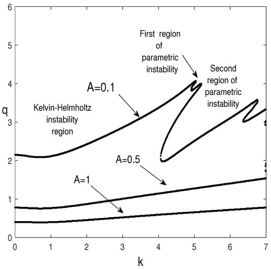 Figure 7 shows that, for a large value of the irrational ratio of frequencies, , the increase in A acts to destabilize the Kelvin-Helmholtz instability and suppresses the parametric instability (resonances) in the range of the wavenumber .