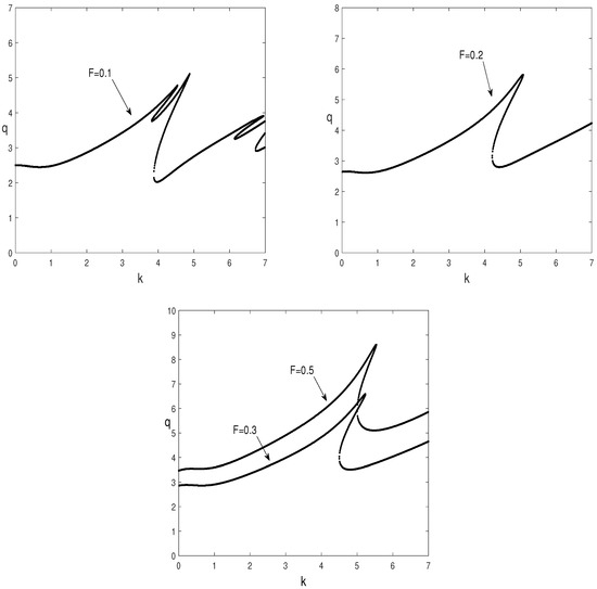 To examine the influence of the damping coefficient responsible for the friction, , the neutral curves, , are presented for different values of F, and for the following assigned values: , , , , and .
