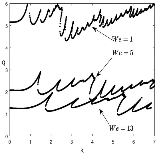 Marginal stability curves, , for different values of the Weber number, , and for , , , , , .