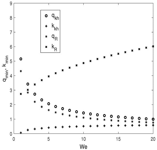 These results are also presented under another aspect in Figure 10, which represents the evolution of the thresholds of the Kelvin-Helmholtz instability, (, ) and of the most unstable resonance, (, ), as a function of the Weber number, . We notice that the critical wavenumber, , slightly increases from almost zero, with the increase in , which means that the instability without the threshold becomes with threshold. However, the corresponding critical amplitude decreases with , thus showing a destabilizing effect. Likewise, the increase in decreases the critical amplitude, , of the first parametric instability and increases the corresponding wavenumber.