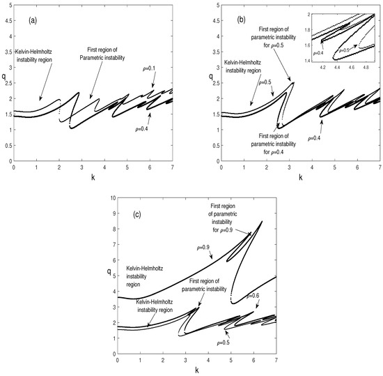 The effect of the density ratio, , on the Kelvin-Helmholtz and parametric instabilities, is considered in Figure 11a–c. The configuration is initially stable , hence the density ratios are chosen to be less than unity. In Figure 11a, it is found that, in the interval , an increase in the density ratio decreases the threshold values of the most unstable resonance, which corresponds to the first one as well as the threshold values of the Kelvin-Helmholtz instability whose zone widens.