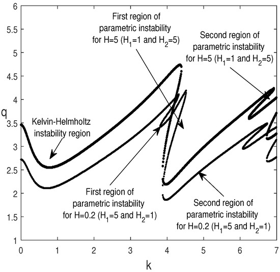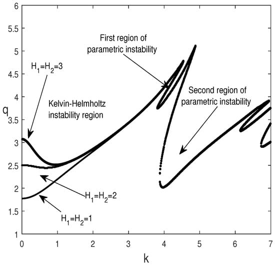 Figure 14 illustrates the evolution of the dimensionless amplitude of oscillation, q, versus the wavenumber, k, for different values of H () and for the same other parameters as in Figure 13. It turns out that increasing H has a stabilizing effect on the Kelvin-Helmholtz and parametric instabilities.