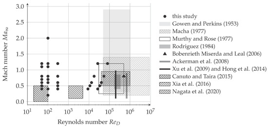 Macha [2] performed wind tunnel tests in order to determine the drag coefficient for a Reynolds number range of and a Mach number range of . One of the most important findings is the reduction in from to , caused by the formation of shock waves. In addition, Murthy and Rose [3] performed a series of wind tunnel tests with and . The increase in , as reaches sonic conditions and agrees with the findings of Macha [2]. Furthermore, it was found that the detectable vortex shedding ceases at . The ranges and were investigated by Rodriguez [4] using a wind tunnel. It was found that the coupling between the near wake and the vortex street increases with increasing . As soon as local regions of the flow reach sonic conditions and shocks occur, the coupling between the vortex street and the near wake is cut off. The upstream flow field is now independent of the vortex street. In addition, the Strouhal number is approximately 0.2, except for a rise when the quasi-steady regime is reached. In addition, the drag and lift coefficients, and , were calculated from the pressure measurements. Ackerman et al. [5] experimentally investigated time-resolved pressure distributions at and . From these measurements, the surface pressure fluctuations, , and the occurring flow regimes were evaluated. For , local regions of flow around the cylinder reach sonic conditions, but only on one side of the cylinder at a time. The flow enters the intermittent shock wave regime. As increases beyond 0.4, increases. The region downstream of the cylinder, in which the vortices are formed, shortens. Beyond around , the flow enters the permanent shock wave regime and decreases. Once the flow enters the wake shock wave regime below , the vortex formation region becomes elongated. A normal shock grows at the point of vortex roll up and increases. Nagata et al. [6] used a low-density wind tunnel with time-resolved Schlieren visualisations, pressure and force measurements, in order to characterise the flow for and . The trend of the effect on the flow field, and the maximum width of the recirculation change at approximately . increases as increases and the increment becomes larger as increases. For , is independent of . For and at , decreases and increases, respectively. Furthermore, it is observed that increases as or increase. Gowen and Perkins [7] measured the pressure distribution around a circular cylinder in subsonic and supersonic flows and calculated for and . It is shown that is not influenced by under the supersonic conditions investigated.