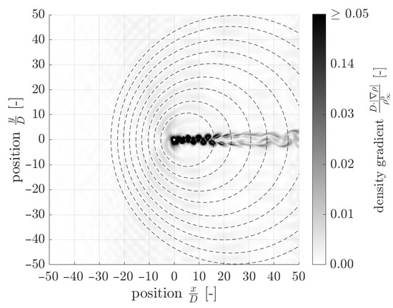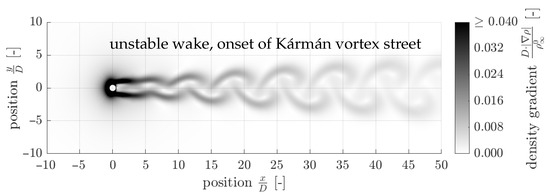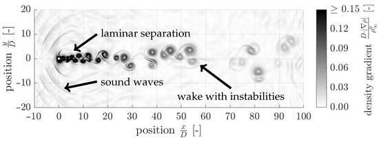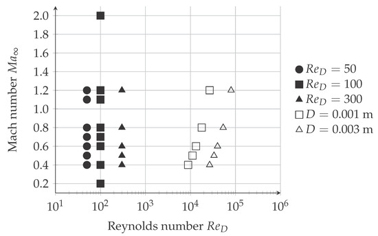 The fluid flow is classified by means of the Reynolds and the Mach numbers and . The Reynolds number defined in Equation (3) describes the ratio of inertial forces to viscous forces and is used to predict the flow regime of laminar, transitional or turbulent flow. It is defined using the free stream density of the fluid, the free stream velocity , the cylinder diameter D and the free stream dynamic viscosity .