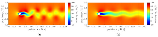 Figure 7a,b show the velocity component of the compressible flow at and , in which the advection schemes “Upwind” and “High Resolution” are compared with each other. The results show that a higher-order advection scheme is necessary for the adequate prediction of the periodic vortex shedding, a so-called Kármán vortex street. In addition, Table 5 shows the time-averaged drag coefficient and the Strouhal number for the incompressible and compressible cases, including a comparison with the literature. A good agreement of and with the literature can be seen with a maximum deviation of approximately 2% and 4%, respectively.