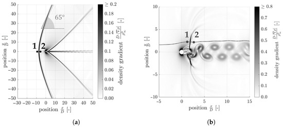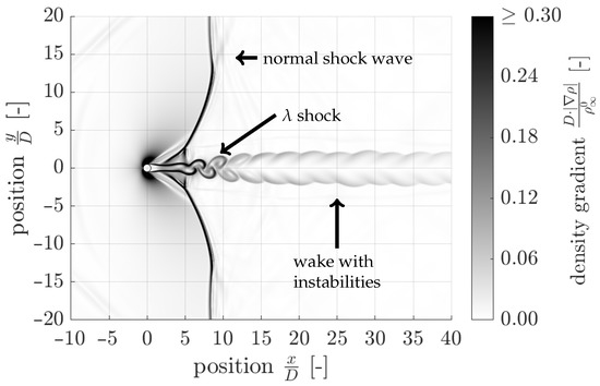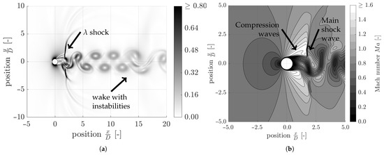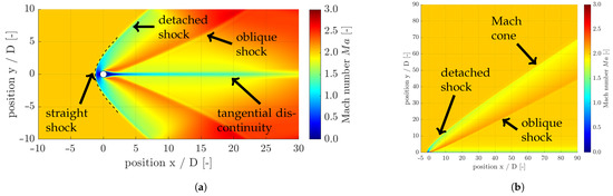 In Figure 8a, a weak reflection of the detached shock at the boundary conditions in the y-direction downstream from around can also be seen. In comparison to Figure 8b, the influence of the boundary condition is clearly visible. For this reason, when simulating the flow around the planar circular cylinder, it must be ensured that the limitation of the flow region in the y-direction is chosen sufficiently. In addition to the detached shock, two oblique shocks form downstream of the cylinder or obliquely away from the cylinder. Analogously to the detached shock, this is followed by an abrupt change or a discontinuity of the flow variables. A wake with a very small velocity forms downstream of the cylinder. This wake is separated from the rest of the flow area by a tangential discontinuity; for more details, see Section 5.1.