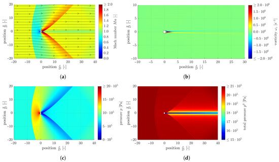 In the wake of the cylinder, a detachment forms at and , which is characterised by two converging shear layers further downstream of the cylinder. There is no mass flow across this tangential discontinuity (Figure 10) and because of that the normal velocity component on both sides of the tangential discontinuity must be zero. Therefore, the streamlines are parallel in the area of the tangential discontinuity, which can be seen in Figure 9a. As shown in Figure 9a, there is a discontinuity in the Mach number and in the tangential velocity component. Due to this change in the tangential velocity, a theoretically diverging vorticity (see Equation (9)) results, which can be used to identify the tangential discontinuity. Due to the mesh resolution, which is finite, there is no abrupt discontinuity in the tangential velocity component; however, the value of the corresponding vorticity component still becomes very large.