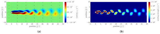 The question arises, how the vortices can be distinguished from other flow phenomena. The z-component of the vorticity is shown in Figure 11a, whereby the left-turning and right-turning vortices have a different sign. In contrast to the tangential discontinuity, the streamlines cross areas of different orders of magnitude of the vorticity. Vortices are rather smeared out compared to shocks and tangential discontinuities. In addition, vortices are decently visible in the swirling strength , as shown in Figure 11b (the swirling strength denotes the imaginary part of the pair of complex-conjugated eigenvalues of the velocity gradient tensor. Thus, in the case where the velocity gradient tensor is symmetric, the swirling strength is zero).