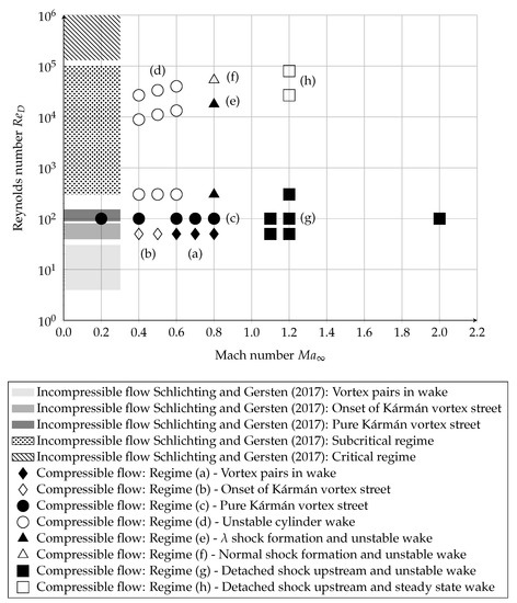 The eight flow regimes, denoted by (a) to (h), are shown in Figure 12 and compared to the incompressible regimes from Schlichting and Gersten [1]; incompressible flow is assumed as . The occurring compressible regimes (a) to (c) at to 100 and are similar to the incompressible regimes. It is observed that subsonic of suppress the vortices in the wake of the cylinder for , whereas the incompressible flow regime at shows an onset of the Kármán vortex street. Increasing with subsonic and leads to regime (d), which is similar to the incompressible subcritical regime. In contrast, sound wave propagation is shown in compressible flow. The regimes (e) to (h) differ from the incompressible regimes, because the is far away enough from the incompressible flow. For and , shocks as well as vortices are formed. In the supersonic regimes, it is observed that a detached shock upstream of the cylinder and two oblique shocks downstream of the cylinder are formed. In addition, for and , regime (g) occurs and vortices in the wake of the cylinder are formed. For higher Mach numbers , the wake of the cylinder is steady and symmetric; this corresponds to regime (h).