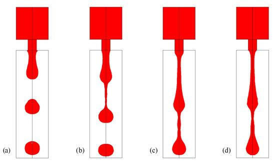Droplet ejection simulation for various Oh: (a) 0.066, (b) 0.656, (c)1.312, (d) 1.967 [4]. The figure is reproduced with permission from the author.