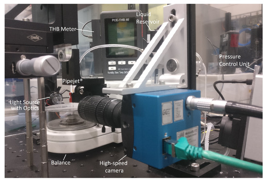 TestRig. It consists of a dispenser (BioFluidix PipeJet®, Freiburg im Breisgau, Germany), a high-speed camera (MotionBLITZ EoSens® mini2, Mikrotron GmbH, Unterschleissheim, Germany), a pressure control module (ActivePCR, BioFluidix GmbH, Freiburg im Breisgau, Germany), a balance (SC2 Ultra-Microbalance, Sartorius AG, Goettingen, Germany), and a thermo-hygrometer.