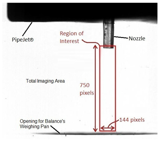 The tip of the nozzle was kept in the frame. This was primarily because the droplets have a high degree of spatiotemporal changes when leaving the nozzle, which can be interesting for the classification task. Moreover, the nozzle of known diameter can also be used as a reference object for camera zoom and focus. A shadowgraph of the field of view in the imaging plane is given in Figure 4.