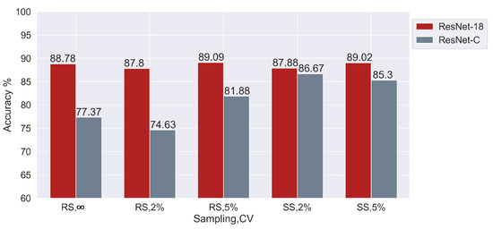 Figure 6 compares the pure 2D architectures on various filtering intensities (expressed as CV thresholds) and sampling conditions. ResNet-C has a lower performance as compared to ResNet-18. This shows that, for the current task, the higher number of layers in ResNet-18 makes it better at extracting the underlying features for every sampling and cleaning condition.