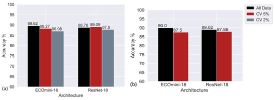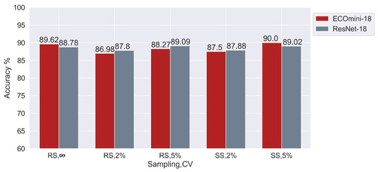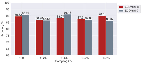 Next, Figure 7 compares ECOmini-18 and ECOmini-C on various CV and sampling conditions. ECOmini-18 and ECOmini-C showed similar performance on the given dataset. This shows that adding the 3D layers with the ResNet-C helps it to extract more useful information from the current dataset.