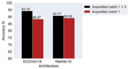 The performance of the neural networks increases when the training is performed on acquisition batch 1 and 3 jointly. The ECOmini-18 model obtained by training on acquisition batch 1 and 3 jointly was the best model in the entire study.