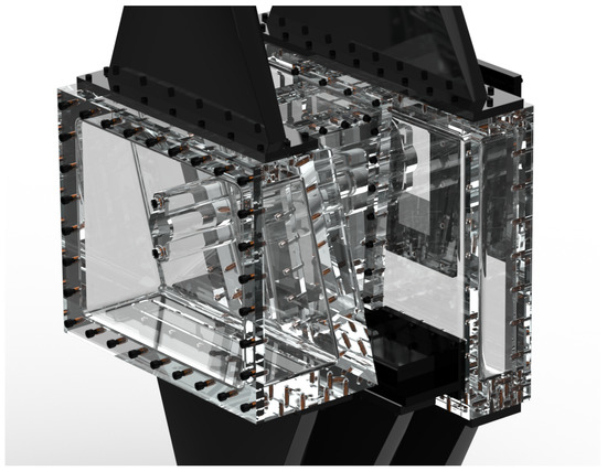 The centrepiece of the rig was a machined PERSPEX® (acrylic glass) model of a TCF ring segment (illustrated in Figure 1), the flow through which was examined by PIV. Its geometry was scaled and simplified to improve optical access to the interior: curved surfaces, such as the vane and hot gas duct walls, were generally approximated with flat panels to avoid unnecessarily complex reflections. The block on the air inflow side mimicked a segment of the hollow outer ring, which was connected to the hub cavity of the inner ring on the opposite side of the hot gas duct by a symbolic load-carrying strut. The strut was encased in a fairing, under which the cooling air passed between the cavities.