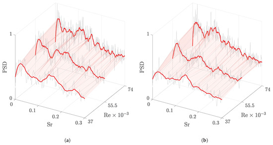 The results of this evaluation are presented in Figure 4. The PSDs at different flow regimes were grouped by position ; the raw spectra are each shown in grey along with a smoothed spectrum, depicted in red, obtained by applying a Savitzky–Golay finite impulse response filter (SGF) of order three with a frame length of 31 data points. The SGF is based on low-order polynomial fits and the linear least-squares method and is commonly used to smooth 1D data in signal processing and experimental applications such as spectroscopy [24,25]. The filter is a convenient tool to identify trends in an otherwise noisy spectrum, which establishes an overview of the flow dynamics; at the same time, the spectral clarity in low frequency bands remains superior to simply evaluating the FFT with smaller block sizes. The frequency axis was nondimensionalised as the Strouhal number to ease the comparison of the data at different Reynolds numbers, where is the nominal inlet flow speed.