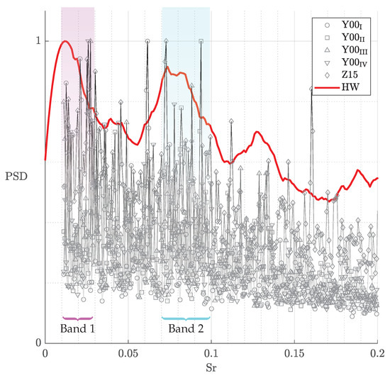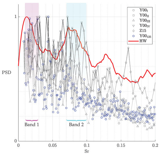 Figure 5 shows the leading modes of the runs introduced in Section 5.1, as well as the Strouhal number bands obtained from evaluating the hot wire data at in which the reference exhibited increased activity. The filtered hot wire spectrum at and was included as a prediction for the shape of the PSD distribution. For the sake of simpler qualitative analysis, the spectra were normalised by the tallest detected peak in each measurement. Additionally, in working with the PIV data, PSD information below was consistently chaotic and unrepeatable. This likely was a result of a very small number of full cycles being included in the recording; consequently, these data were excluded from the following analysis. Note that, due to the complexity of the signal, each individual measurement was unlikely to produce the exact desired result. Instead, we chose to evaluate the superposition of measurements, as with , we expected the cumulative spectrum to approach the reference.