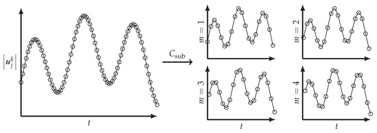 Figure 6 demonstrates the subsampling method for a fictional scalar value at a single point in the control volume, . The progression through time corresponded to the column index k. For illustrative purposes, a low base sampling frequency was chosen.