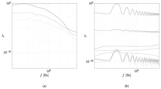 Without subsampling, as seen in Figure 7a, the spectrum contained a single broad peak at —even with the balance shifted heavily towards the frequency resolution, as was so large that the data yielded only three modes. The results were drastically more favourable once subsampling was applied: Figure 7b shows a a clear peak at , as well as a series of progressively weaker harmonics at , , which was consistent with the results obtained by other analyses of the dynamics of the Kármán vortex street [27]. Simultaneously, and low amplitudes for the lesser modes showed the reliable statistical convergence of the process.