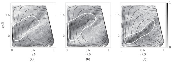 The baseline for understanding the dynamics of any fluid system is examining the time-averaged conditions. Fortunately, low-speed PIV data recorded at are abundant from previous investigations of the same model [22]. While these recordings proved unhelpful in exploring the time evolution of the system, they were useful for gaining an overview of the mean flow through the fluid domain. The time-averaged flow speed for is presented in Figure 3a.