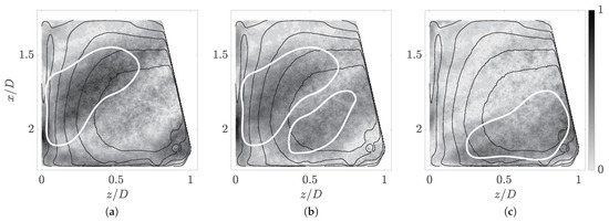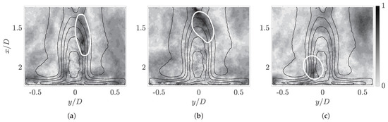 A PIV experiment can be tailored to optimally resolve any system by adjusting several process parameters. The first barrier is the successful evaluation of the images recorded through PIV, which provides the instantaneous velocity fields that form the basis for all further post-processing. The experiments showed that the maximum particle displacement, beyond which the DaVis cross-correlation algorithm failed to reliably converge, was reached if the inflow Reynolds number meaningfully exceeded . This flow regime was, thus, chosen for the HSPIV measurements, as the analysis of anemometry data in Section 4.2 suggested that strong fluctuations were already present in the system at this point, and the behaviour showed significant commonality with higher Reynolds number regimes.